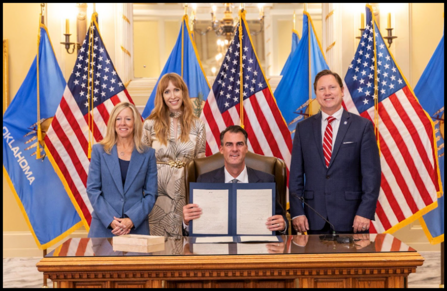 Tricia Everest, Oklahoma’s Secretary of Public Safety, Lauren Krisai, Executive Director of Justice Action Network, and Rep. Brian Hill (R) stand behind Governor Stitt as he signs HB 2364 in 2025